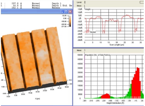 Tencor P-17测量2D和3D纹理,量化样品的粗糙度和波纹度。软件过滤器将测量结果分为粗糙度和波纹度两部分,并计算出均方根、粗糙度等参数。