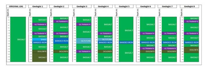 视觉地质测井的主要问题是每个地球科学家对于所看到的岩石都有他们自己的经验、观点和想法。如果把多个地球科学家针对某个特定项目得到的数据综合在一起,则会使情况变得非常复杂。图1说明了视觉观察的主观性,图中显示了8个地球科学家针对同一个岩石层序所提供的测井数据。图中有7个不同的结果(第6个或第7个地球科学家复制了对方的结果)。