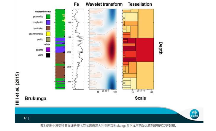 使用小波变换曲面细分技术显示来自澳大利亚南部Brukunga井下样本的铁元素的便携式XRF数据。