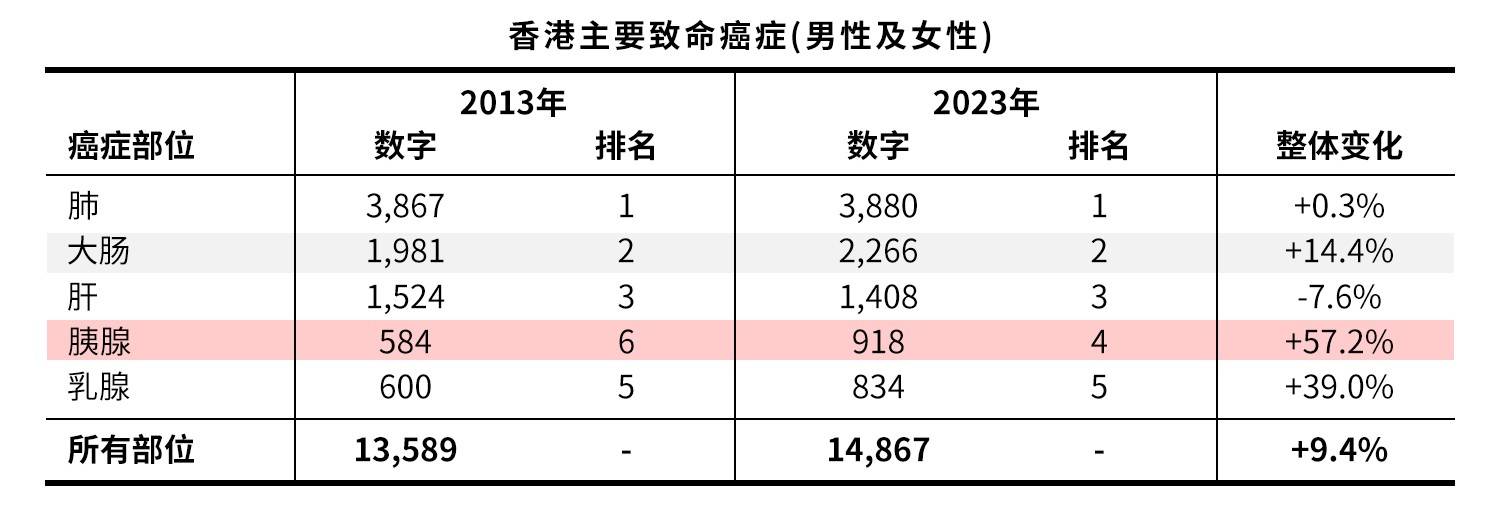 据香港卫生署统计数据显示,胰腺癌死亡病例由 2013 年的 584 例上升至 2023 年的 918 例。过去十年间,胰腺癌致死率大幅上升 57.2%[1],使其成为增速最快、威胁极高的恶性肿瘤之一。香港特区行政长官施政报告明确提出加强癌症预防,将癌症早筛、早诊、早治提升至公共卫生优先策略。在香港癌症防控布局中,胰腺癌已被纳入重点关注的高致死性癌种。